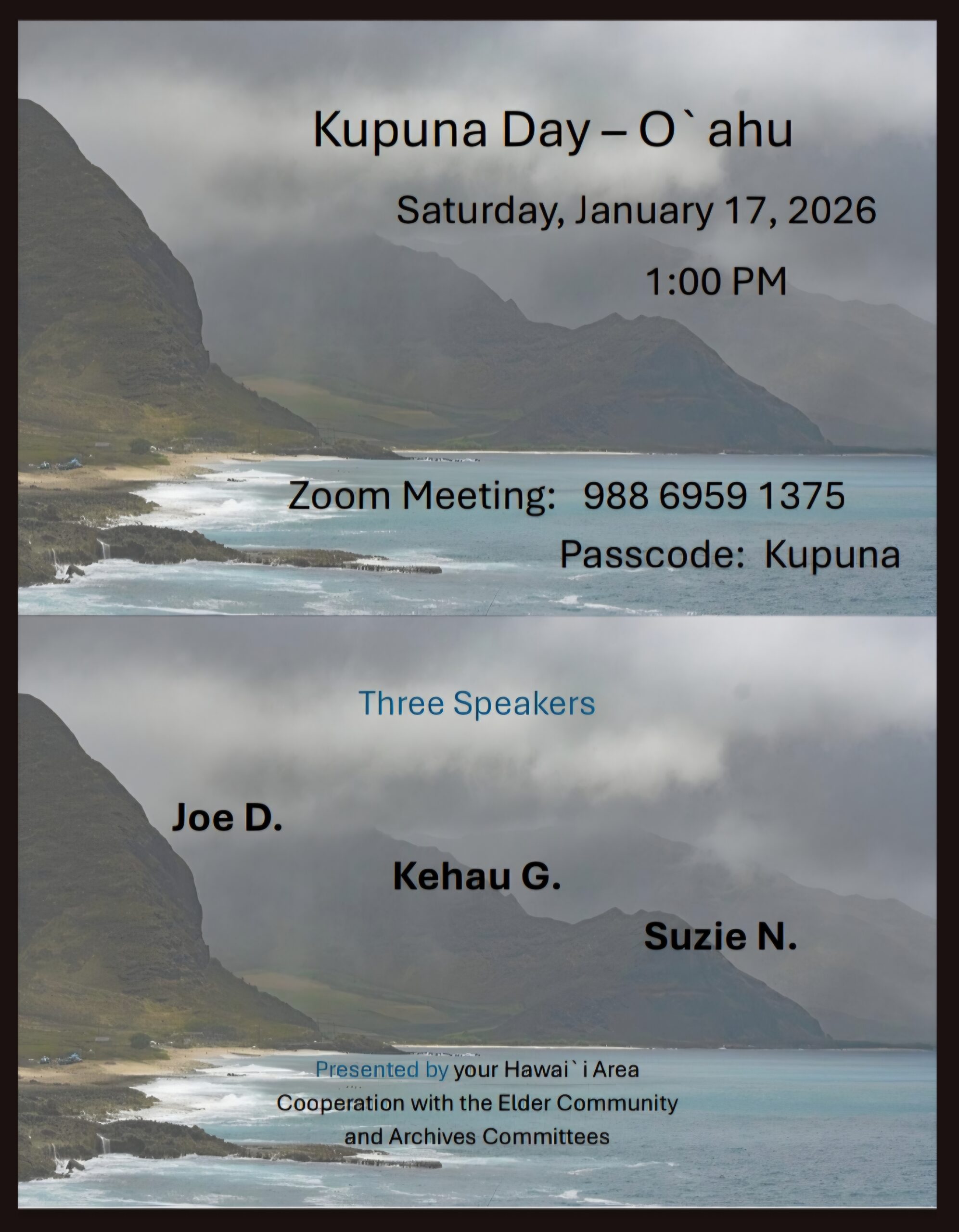 Learn how we can carry the message beyond the group at the Puna Committee Workshop sponsored by CPC (Cooperation with the Professional Community) to be held at the Puna Hongwanji 12-4pm (lunch provided) on Sunday May 17 2026. Click here for a flyer to share with the groups you attend.