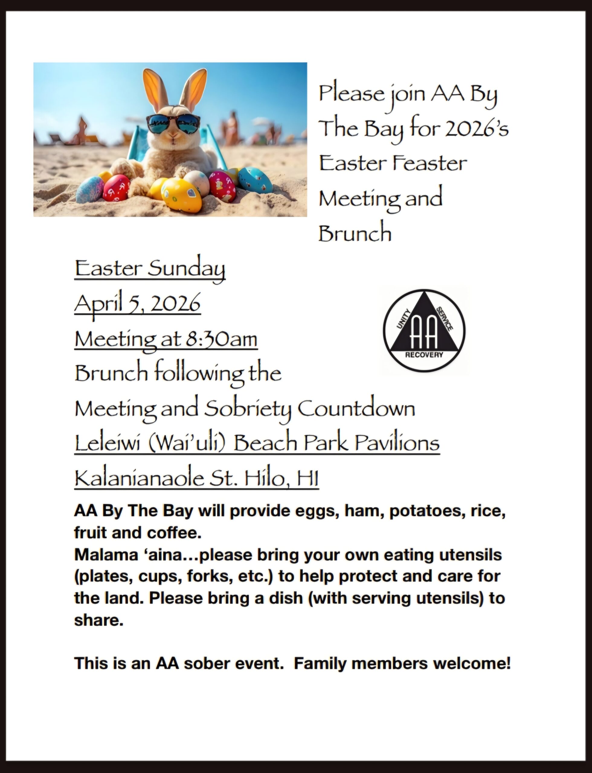 Join AA by the Bay for their annual Easter Feaster celebration & brunch April 5th at Leleiwi Beach Park. Come for the regular meeting at 8:30am and stay for the festivities. Click here for a flyer and more information.